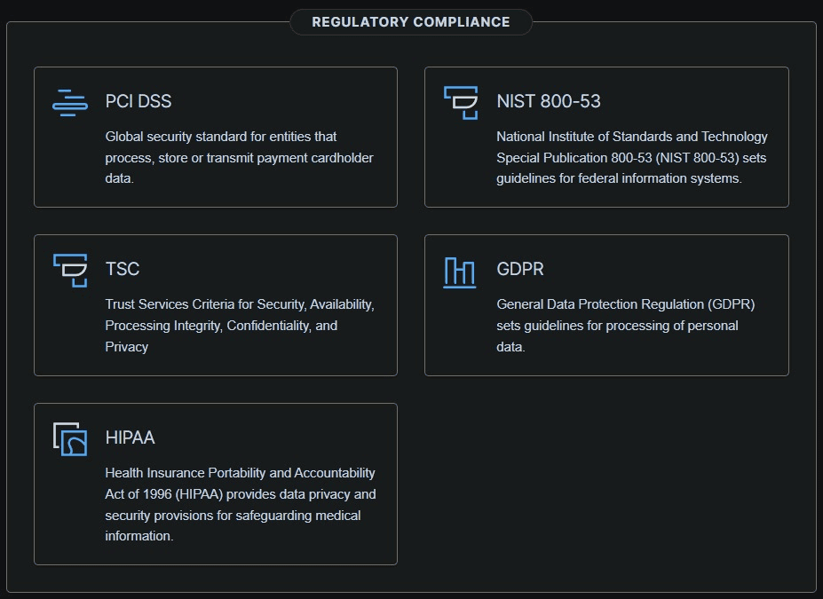 Raptor Eye checks compliance with PCI DSS (Payment Card Industry Data Security Standard), NIST (National Institute of Standards and Technology), HIPAA (Health Insurance Portability and Accountability Act), and GDPR (General Data Protection Regulation).